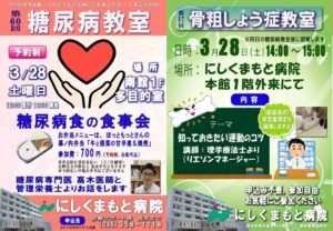 12:30~糖尿病教室、終了後14:00~骨粗しょう症教室です。最初の糖尿病教室は糖尿病食の食事会なので申込が必要ですが、骨そ教室は申込不要で参加自由です。